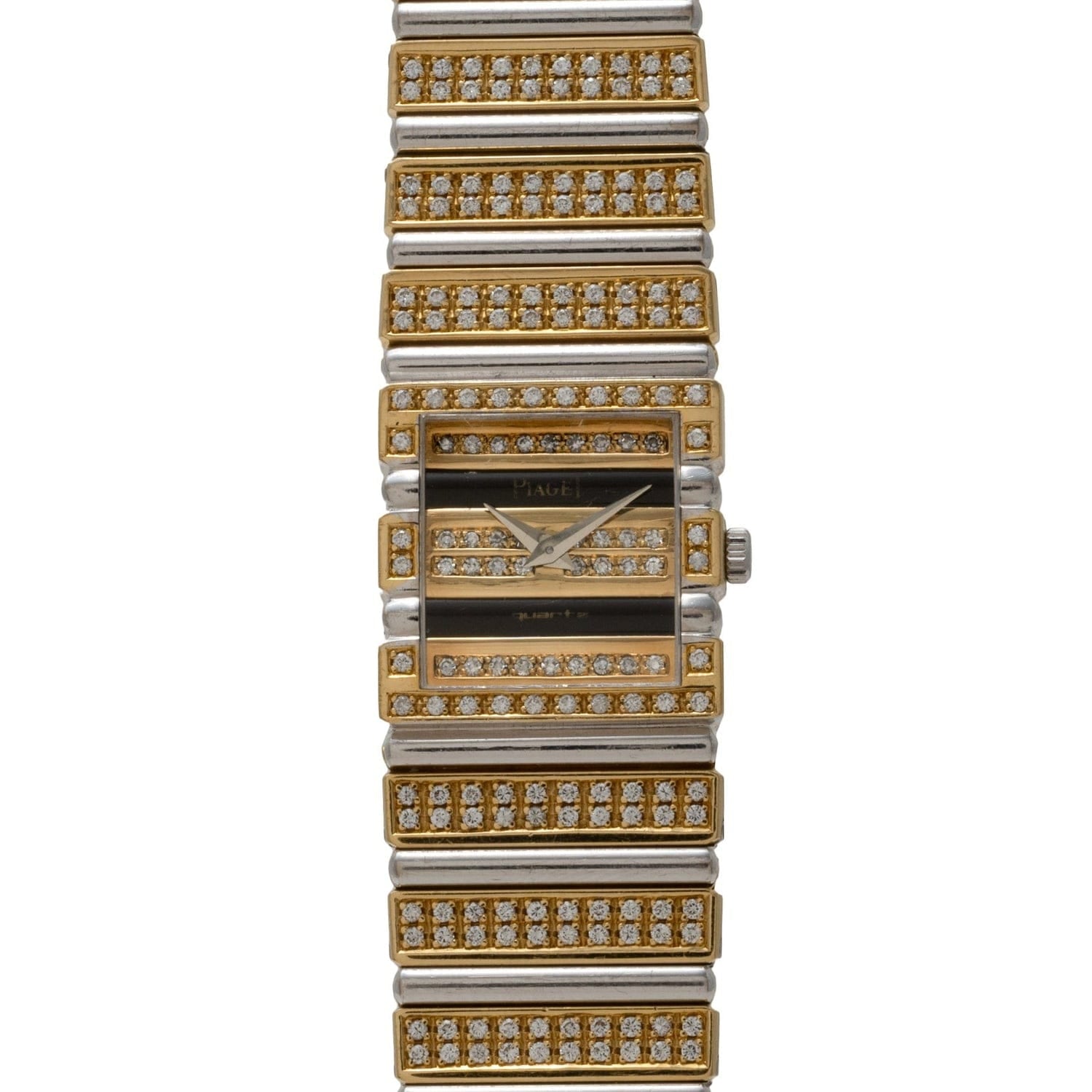 Bracelet: Integrated 18K white and yellow gold bracelet with factory diamond settings, sized for ~6" wrist